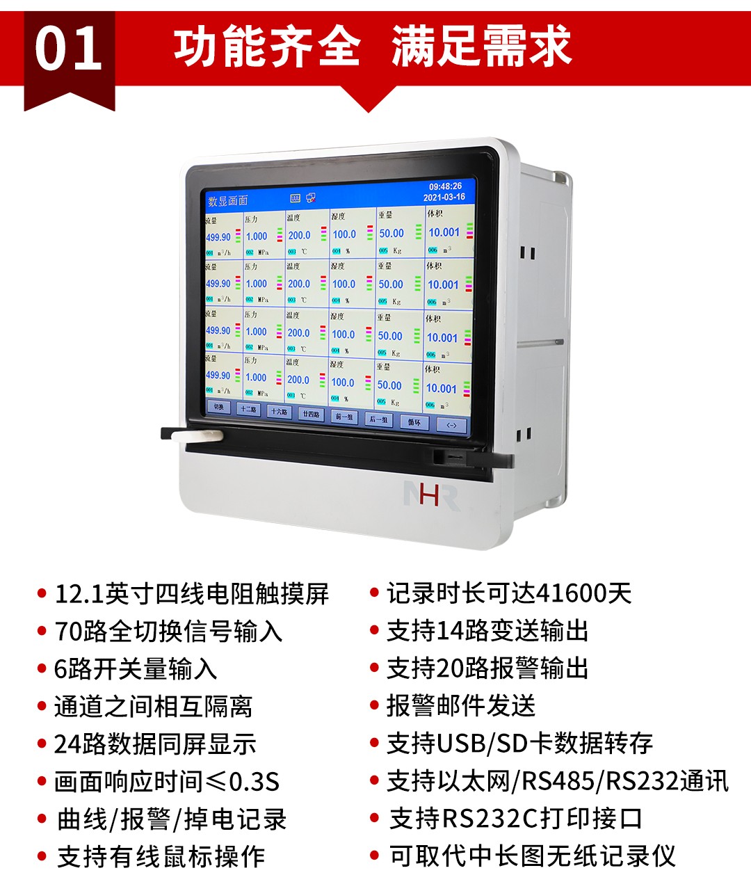 NHR-9100/9700系列觸摸數(shù)據(jù)采集控制工作站采用新型大規(guī)模集成電路,對輸 入、輸出、電源、信號采取可靠保護和強抗干擾設(shè)計。70路萬能信號輸入??蓭?0限報警輸出,14 路變送輸出,6路DI輸入,RS232/485通訊接口,以太網(wǎng)接口,微型打印機接口和USB 接口,SD卡插座;支持無線鼠標操作。