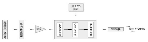 儀表通過(guò)壓力傳感器把壓力信號(hào)變?yōu)殡娦盘?hào),再由前置放大器把此電信號(hào)放大濾波,送往CPU的A/D轉(zhuǎn)換模塊進(jìn)行模擬量到數(shù)字量的變換。最后