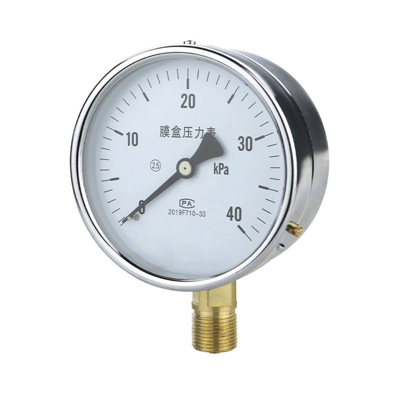 膜盒壓力表采用膜河作為測量微小壓力的敏感元件。測量對銅合金不起腐蝕作用、無爆炸危險氣體的微壓和負壓,廣泛應用于鍋爐通風、氣體管道、燃燒裝置等其他類似設備上。