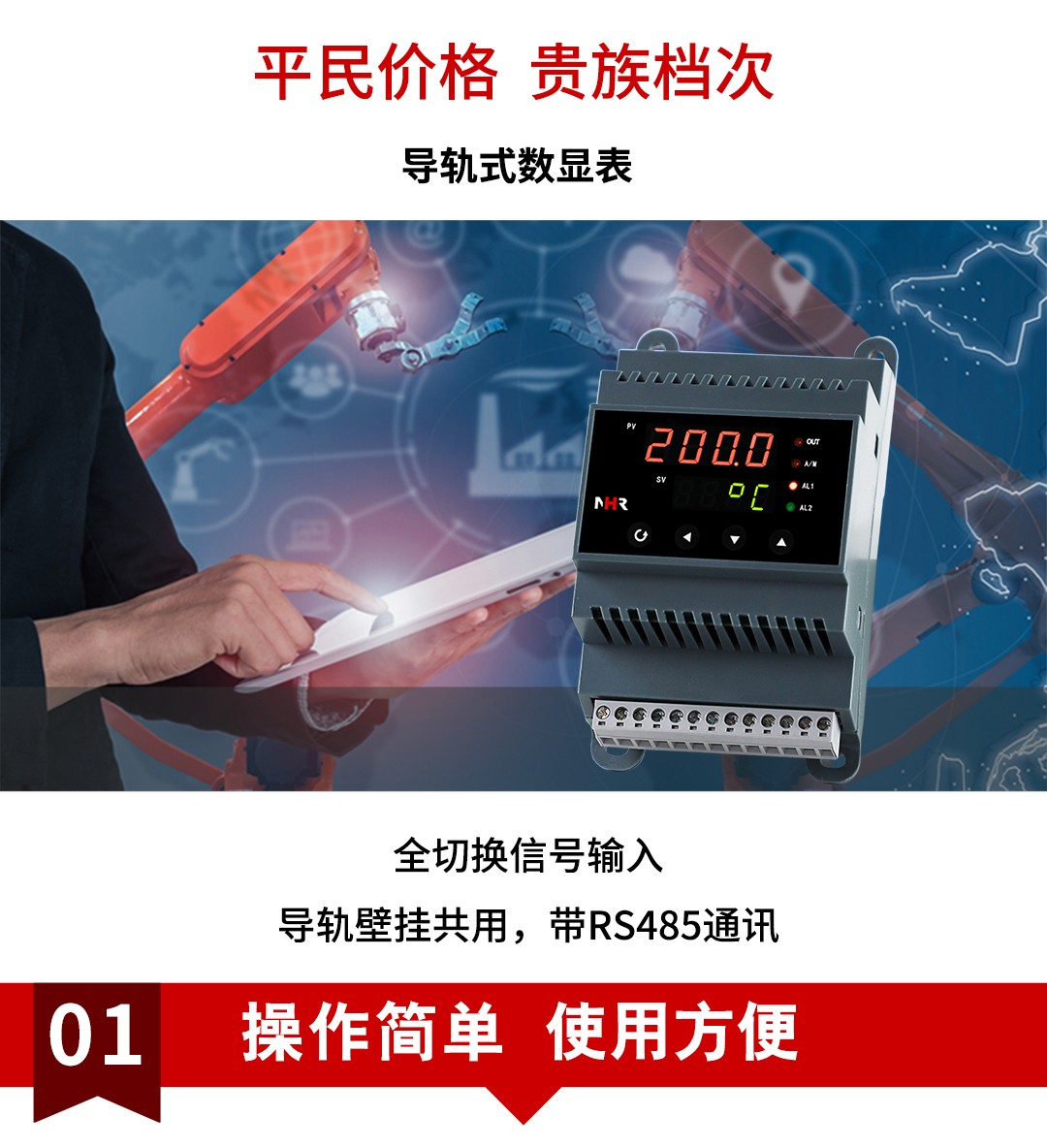 NHR-DN10系列導(dǎo)軌式數(shù)字顯示控制儀采用了表面貼裝工藝,全自動貼片機(jī)生產(chǎn),具有很強(qiáng)的抗干擾能力??蓪囟?、壓力、液位等工業(yè)過程參數(shù)進(jìn)行測量、顯示、報(bào)警控制、變送輸出、數(shù)據(jù)采集及通訊。