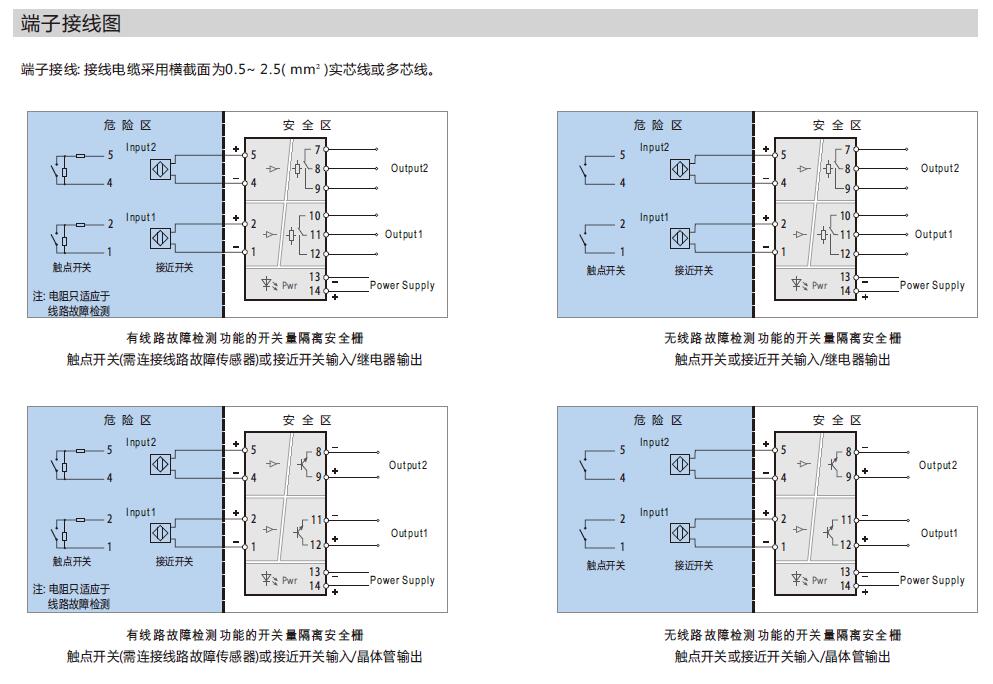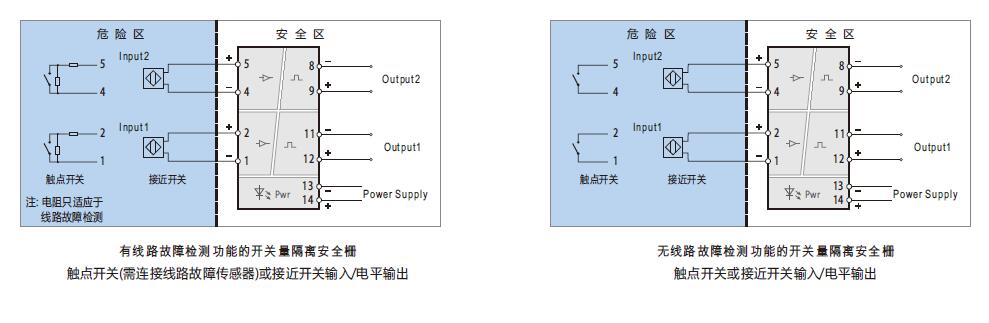 (說(shuō)明: 當(dāng)用到線路檢測(cè)功能時(shí),如果需要使用機(jī)械觸點(diǎn)開關(guān)作為輸入設(shè)備,必須在輸入回路中連接線路故障傳感器,以避免開關(guān)量隔離安全柵將機(jī)械觸點(diǎn)開關(guān)正常的通斷誤當(dāng)做輸入回路的斷路或短路故障。)