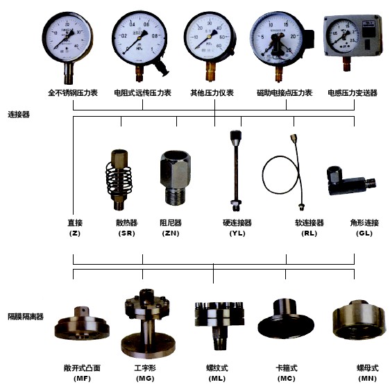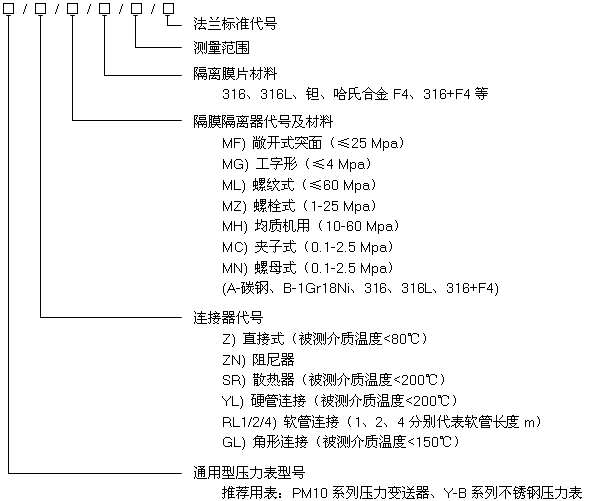 為了擴大各種通用型壓力儀表的使用范圍,能適用于測量強腐蝕、高溫、高粘度、易結晶、易凝固和有固體浮游物介質的壓力,以及對某些測量介質不能直接進入通用型儀表內和便于清洗防止沉淀物持積聚的場合的壓力檢測時,必須采用由隔膜隔離器與通用型壓力儀表組成一個系統(tǒng)的隔膜表。