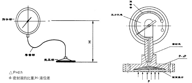 尤其對于帶軟連接管的隔膜表,由于隔膜受壓部與通用型壓力表不在一個水平面上,會產生液位差的影響量△P。在精確測量時更應注意