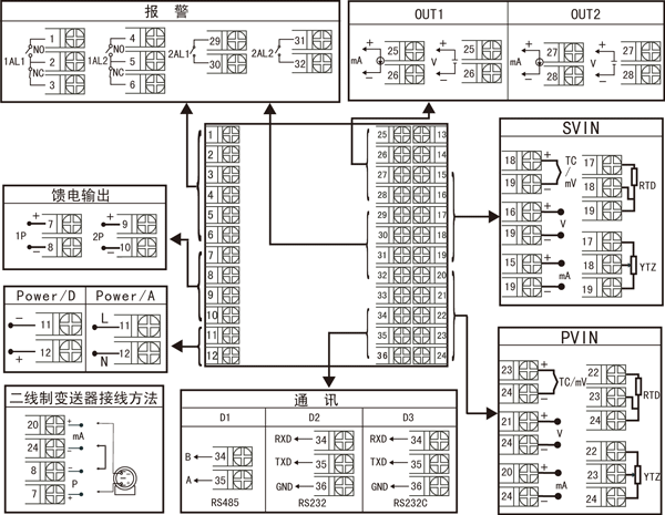 | X D1 D2 D3 | 無(wú)輸出 RS-485通迅接口(Modbus) RS232通迅接口(Modbus) RS232C打印接口 | ⑨供電電源 | |