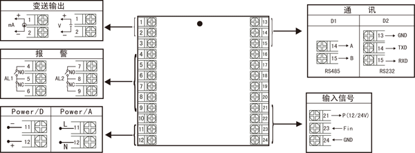 | X 1 2 | 無輸出 1路報警 2路報警 | X D1 D2 | 無接口 RS-485通訊接口 RS-232通訊接口 |