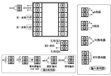智能溫控器,無(wú)通訊,變送輸出和PID控制輸出為4-20mA,輸入信號(hào)為k型熱電偶,儀表帶上、下限報(bào)警輸出,儀表電