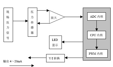 儀表通過壓力傳感器把壓力信號變?yōu)殡娦盘?,再由前置放大器把此電信號放大濾波,送往CPU的A/D轉(zhuǎn)換模塊進(jìn)行模擬量到數(shù)字量的變換。最后由CPU進(jìn)行數(shù)據(jù)處理并顯示及PWM輸出。原理框圖如下: