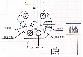 變送器的接線原理如圖所示。端子4接24V電源正端、端子3為4~20mA電流輸出端,該端經(jīng)負載電阻R1后回到24V電源負端。端子1、2接熱電阻,或2接熱電偶正,1接熱電偶負。變送器有零點及量程調(diào)節(jié)電位器,便于用戶進行微量調(diào)整。
