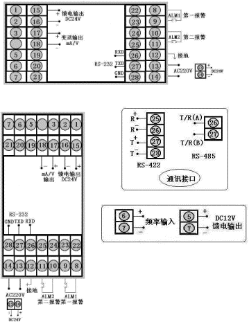 輸出方式 | 01234567 | 無控制輸出繼電器觸點電流 4~20mA電流 0~10mA電壓 1~5V電壓 0~5VSCR-過零觸發(fā)脈沖SSR-固態(tài)繼電器 | |||||||||