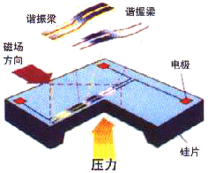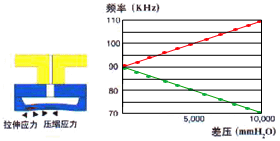 采用微電子加工技術(shù)(MEMS)在一個單晶硅芯片表面的中心和邊緣制作 兩個形狀、尺寸、材質(zhì)完全一致的H形狀的諧振梁,諧振梁在自激振蕩 回路中作高頻振蕩(如圖1)。 單晶硅片的上下表面受到的壓力不等時,將產(chǎn)生形變,導致中心諧振梁 因壓縮力而頻率減小,邊緣諧振因受拉伸力而頻率增加(如圖2)。