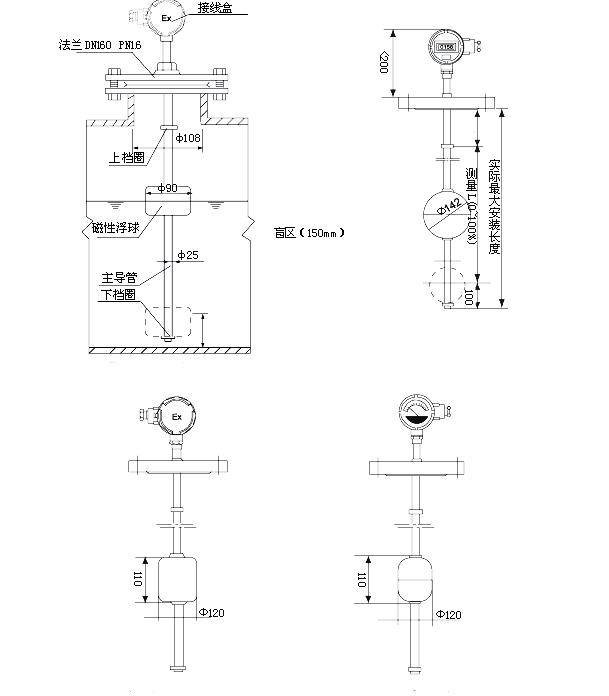 該液位送變送利用帶環(huán)形磁鋼的浮球隨液位升降,使主體管內(nèi)的干簧管吸合,將液位轉(zhuǎn)換成相應(yīng)的電阻輸出,該輸出電阻與本廠智能數(shù)顯儀表配套實(shí)現(xiàn)對(duì)液位的遙測(cè)、報(bào)警和控制。